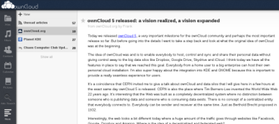 Update: @Cosenal, the app's developer, blogged more details about the News Reader app. - What actually was my main focus was improving the LDAP backend in ownCloud 5. There we have great new things like Support for multiple Bases, even multiple servers, customizable server side search, support for backup servers. Check out the backend and see the LDAP documentation to see how to configure the shiny new stuff. Generall we do have fancy ownCloud display names, which are also made use of by the LDAP backend.